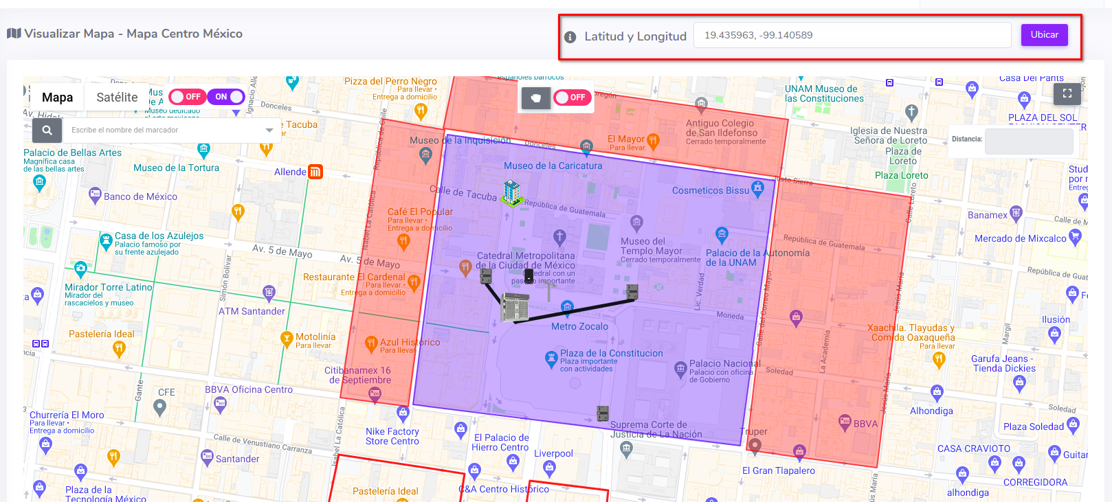 Al dar click en el botón con el texto "Ubicar" colocara el mapa en la ubicación escrita y podrá trazar una linea, esta función es parecida a Medir Distancia de un punto a otro.