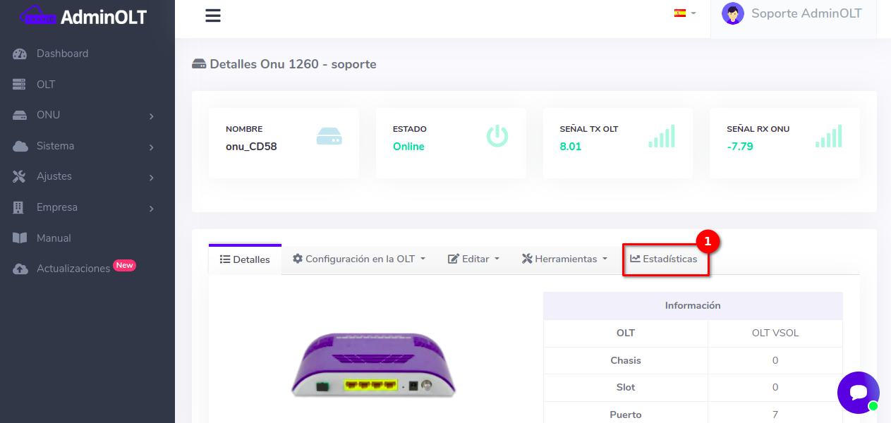Fecha de liberacion 2 de Agosto de 2022 a las 10:13 Gráficas para OLT y ONU (VSOL/WOLCK GPON)Ahora el sistema de AdminOLT ha habilitado que las marcas de OLT VSOL y WOLCK puedan activar el monitoreo. Con esto se podrán mostrar las gráficas de consumo y estado tanto de la OLT y de la ONU.