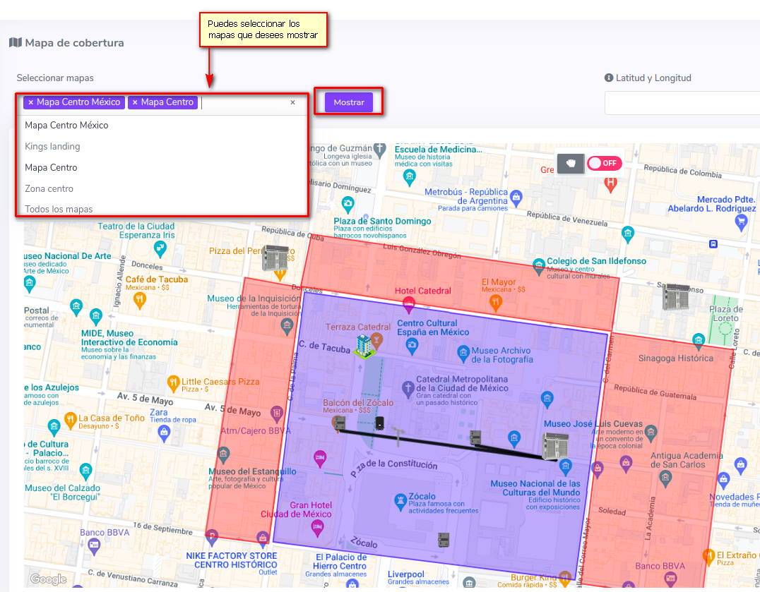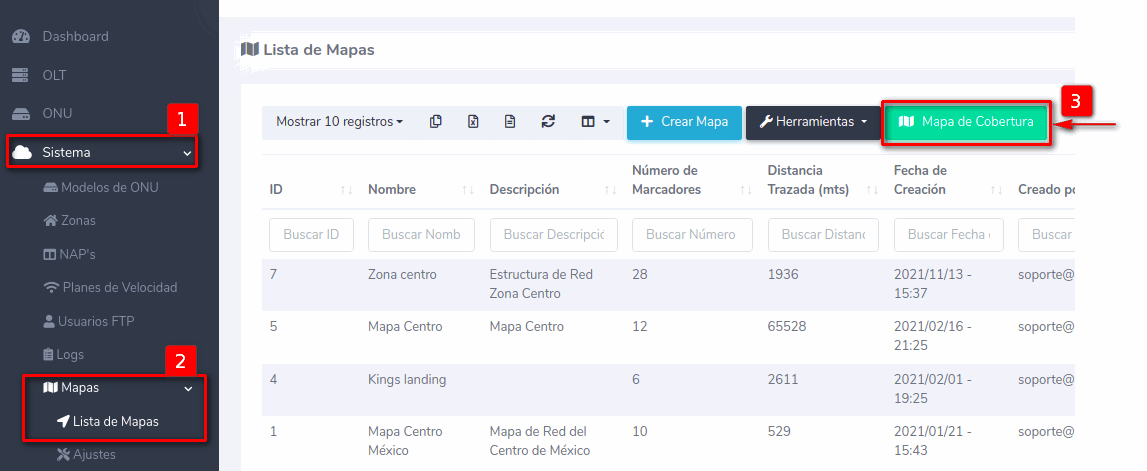 Se agregó un mapa general de toda la cobertura FTTH, donde ahora podrás seleccionar que mapas deseas mostrar, puedes dar click en el botón "Mapa de Cobertura".
