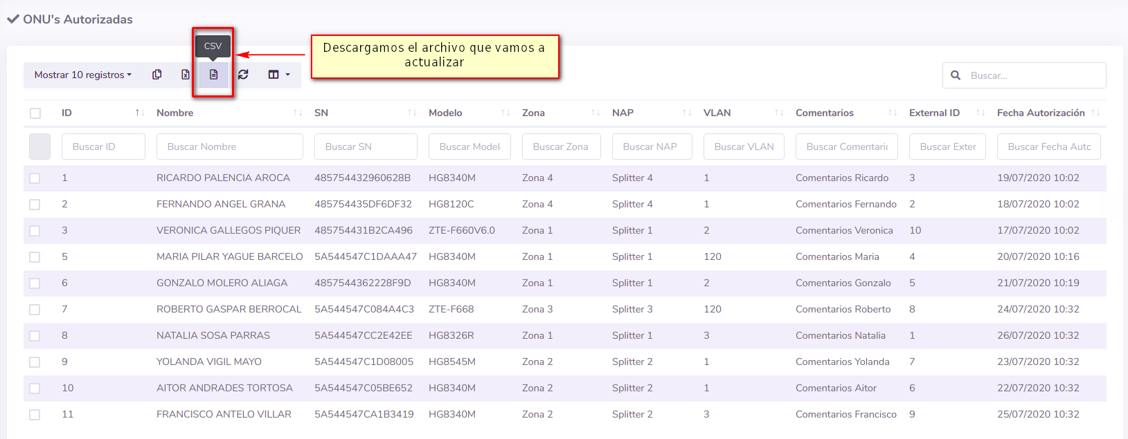 1Como primer paso descargue el archivo CSV desde el listado de ONU's, que se encuentra en el siguiente enlace https://adminolt.com/onu/list/authorized/.