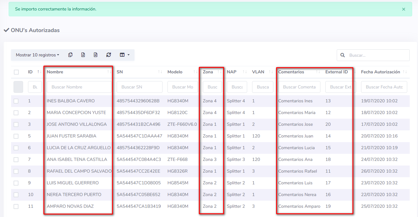 - Zona: Zona a la que pertenece la ONU. (Para cambiar este campo debe seleccionar zonas existentes en AdminOLTy escribirlos igual a como están en el sistema)