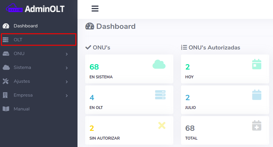 1 Inicie sesión en su cuenta de AdminOLT por medio del dominio que se le brindó en un principio y acceda al apartado, OLT