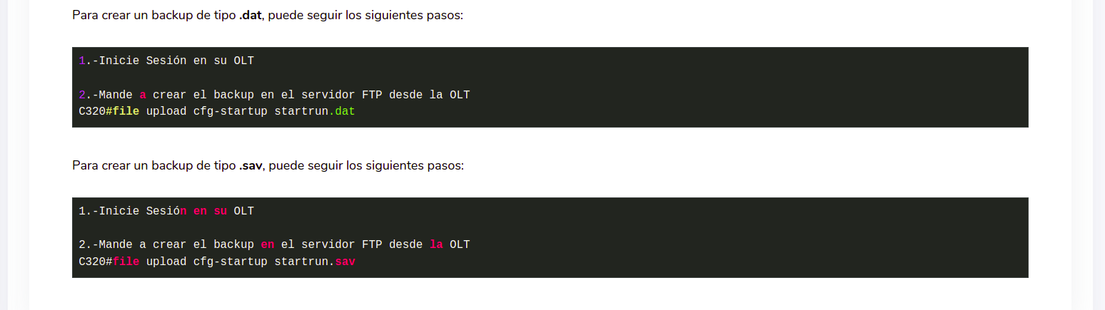 Las OLTs tienen la capacidad de hacer respaldos automáticos o si lo desea puede mandarlos a crear manualmente. Puede leer más sobre estas opciones en los siguientes enlaces: