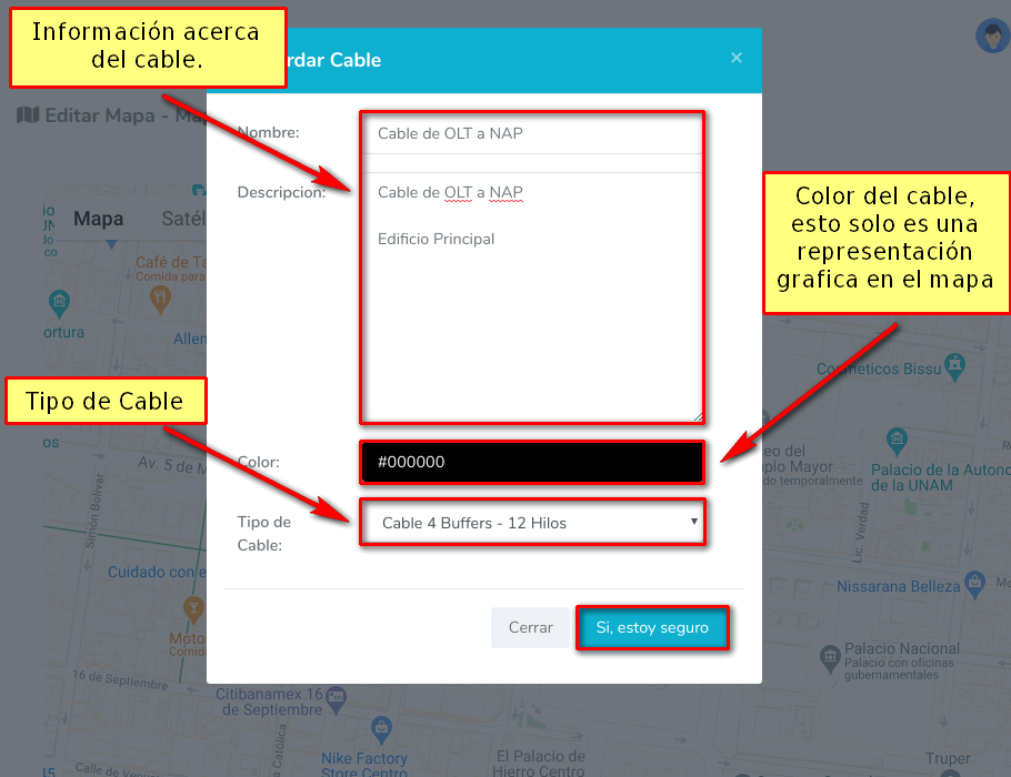Una vez que demos click en el segundo marcador, nos saldrá una ventana donde tendremos que poner la información acerca del cable, después damos click en Si, estoy seguro.