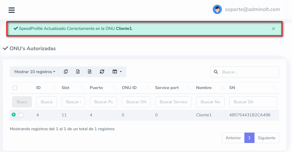 Para este ejemplo usaremos una ONU Autorizada que inicialmente tiene un Plan de 100 Megas Simétrico, en este caso nosotros lo cambiaremos a un Plan de 25 Megas Simétrico.