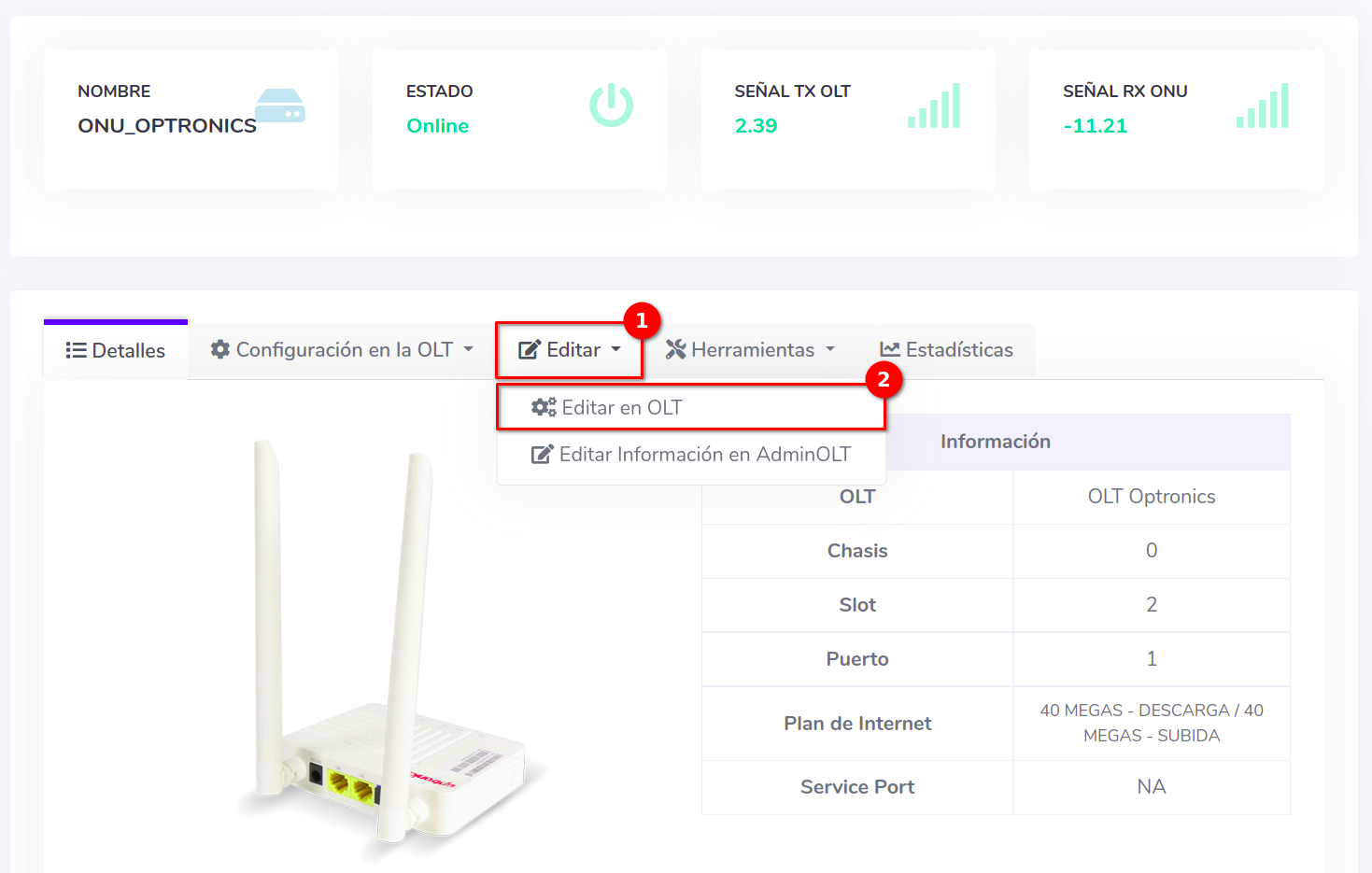 Dar click en el texto Editar en OLT que se encuentra en el botón con la leyenda Editar.
