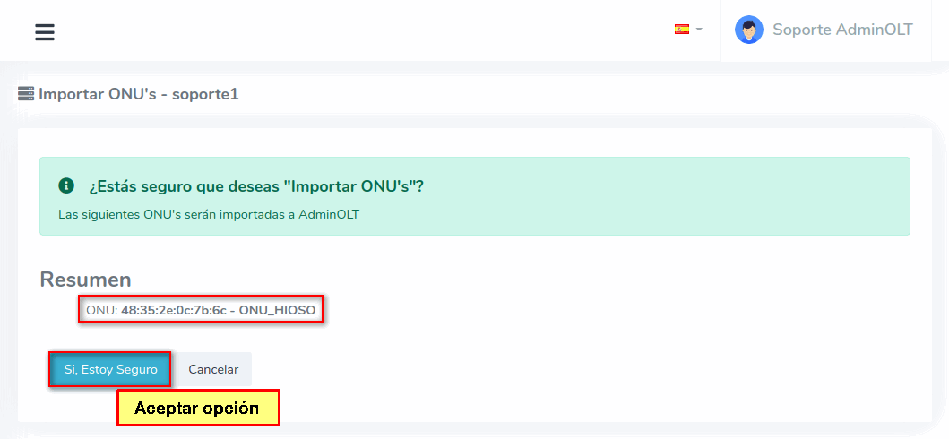 3Una vez que hayamos seleccionado los equipos, importamos las ONU's al sistema AdminOLT