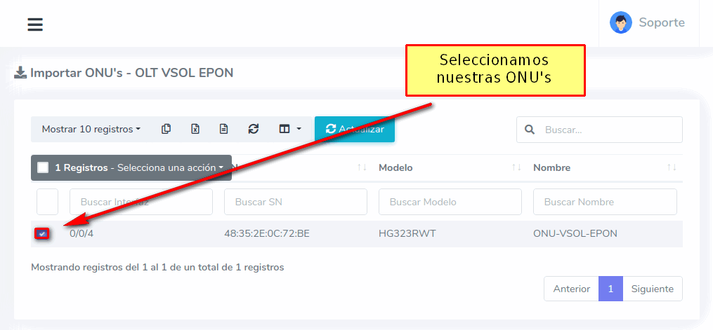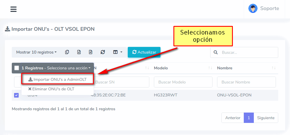 3Una vez que hayamos seleccionado los equipos, importamos las ONU's al sistema AdminOLT