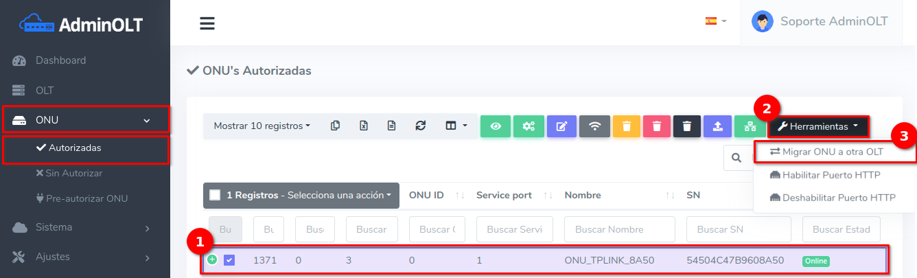1 En ONU's > Lista de Onu's Autorizadas debemos escoger el equipo con el que se trabajará y seleccionar Migrar ONU a otra OLT que se encuentra en el botón con la leyenda Herramientas.