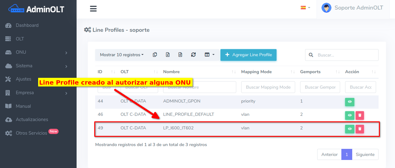 El Line Profile creado automáticamente podrá ser encontrado en la lista de Line Profiles pertenecientes a la OLT.