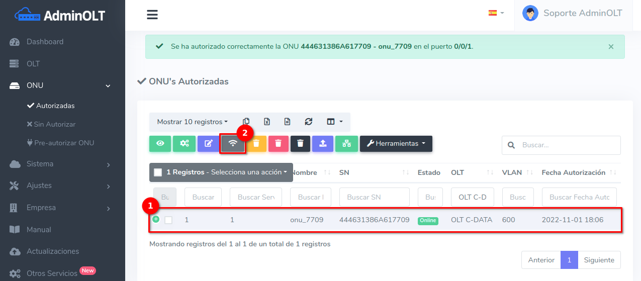 Una vez autorizada la ONU podrán modificar sus planes de velocidad y vlans asociados a los servicios desde la Lista de planes de velocidad.