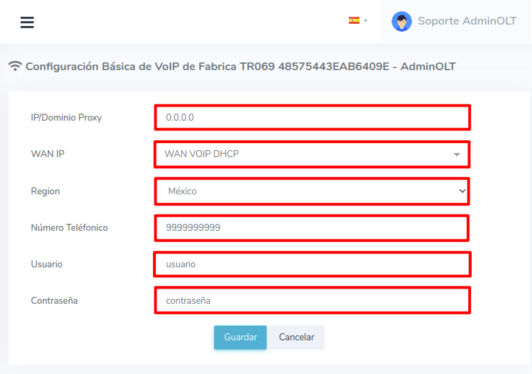 2Completamos la información para la configuración básica VOIP que tendrá la ONU.