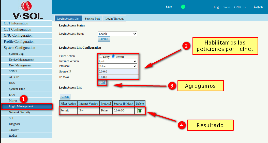 10 Agregamos nuevas reglas de Acceso para permitir el trafico de Telnet y SNMP
