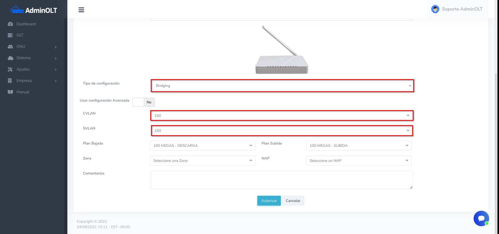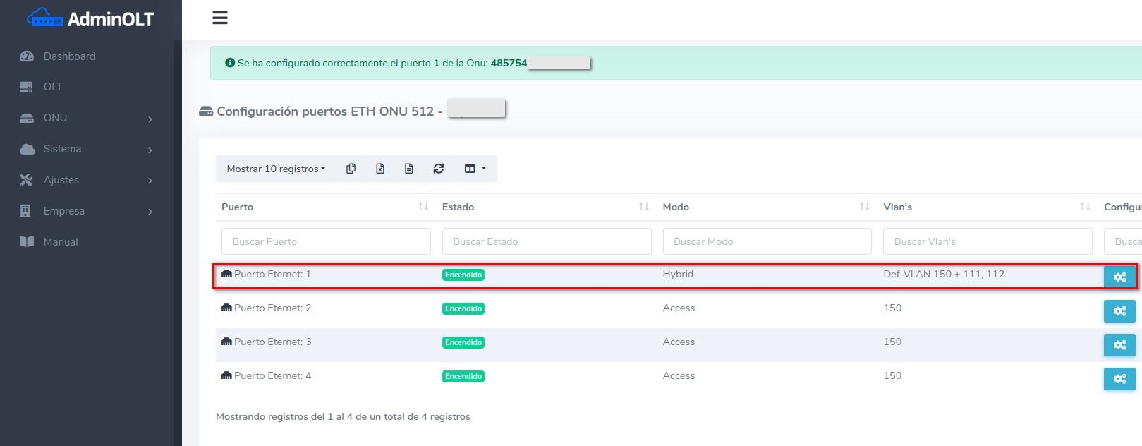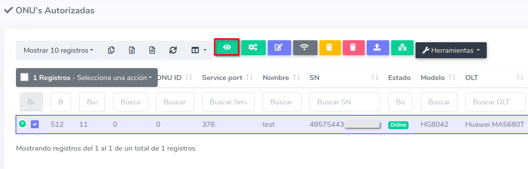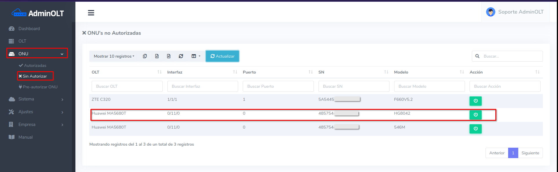 3Dirijase a la sección de ONU > Autorizadas y seleccione la ONU que acaba de autorizar.