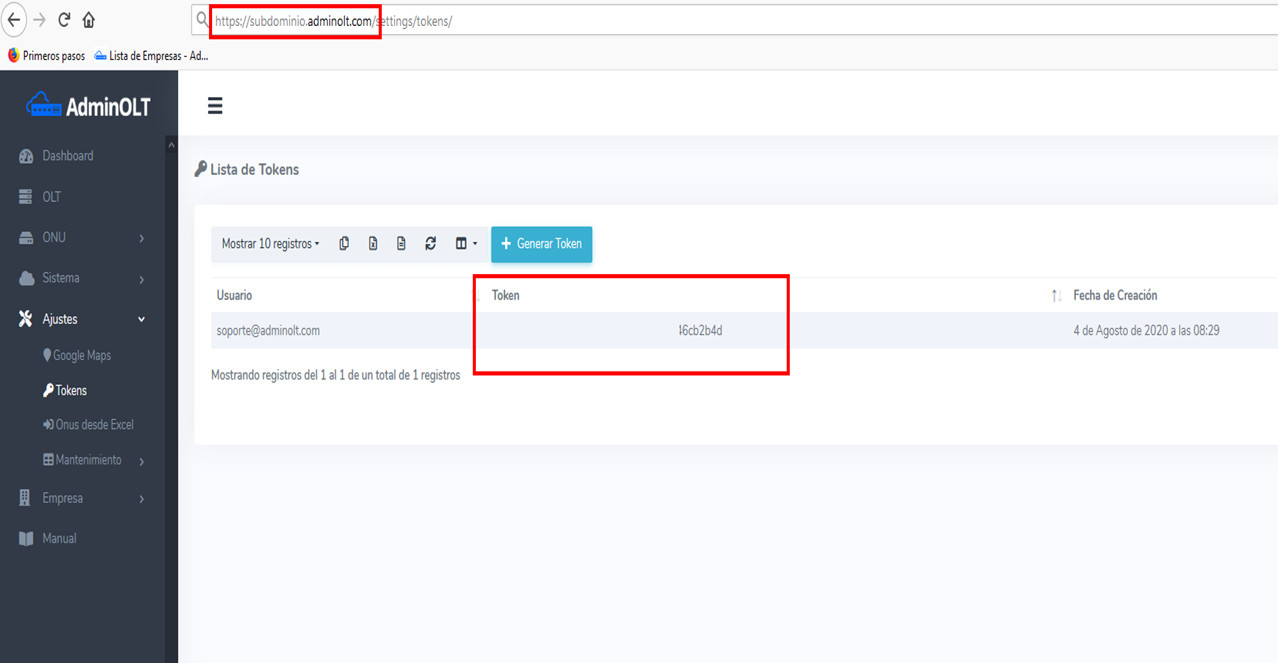1 Ingrese a su cuenta de AdminOLT y a continuación en el menú lateral izquierdo ingrese a Ajustes > Tokens para copiar el token ahí mostrado, de igual forma necesitaremos el subdominio de su cuenta Adminolt, el cual puede copiar directamente del navegador web o bien es el link por el cual usted accede a su cuenta de AdminOLT