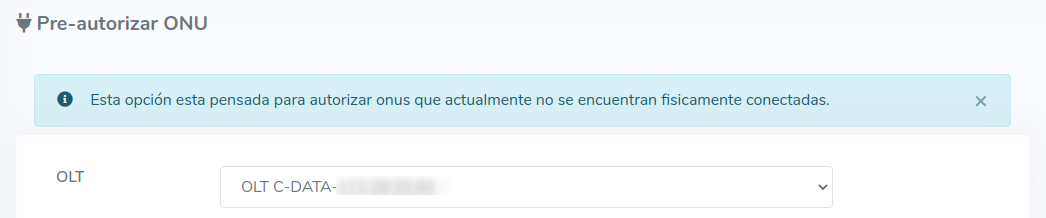Es necesario que como primer paso sea seleccionar la OLT donde se realizara la acción. Al momento de seleccionar alguna OLT, se autocompletarán algunos datos del formulario, por ejemplo Tarjetas, Puertos o VLAN.