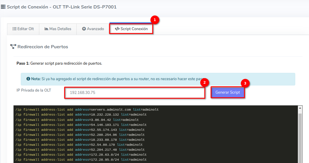 2Aquí ingresaremos nuestra ip privada y seleccionamos la opción Generar Script. A continuación veremos que se nos proporciona un Script.